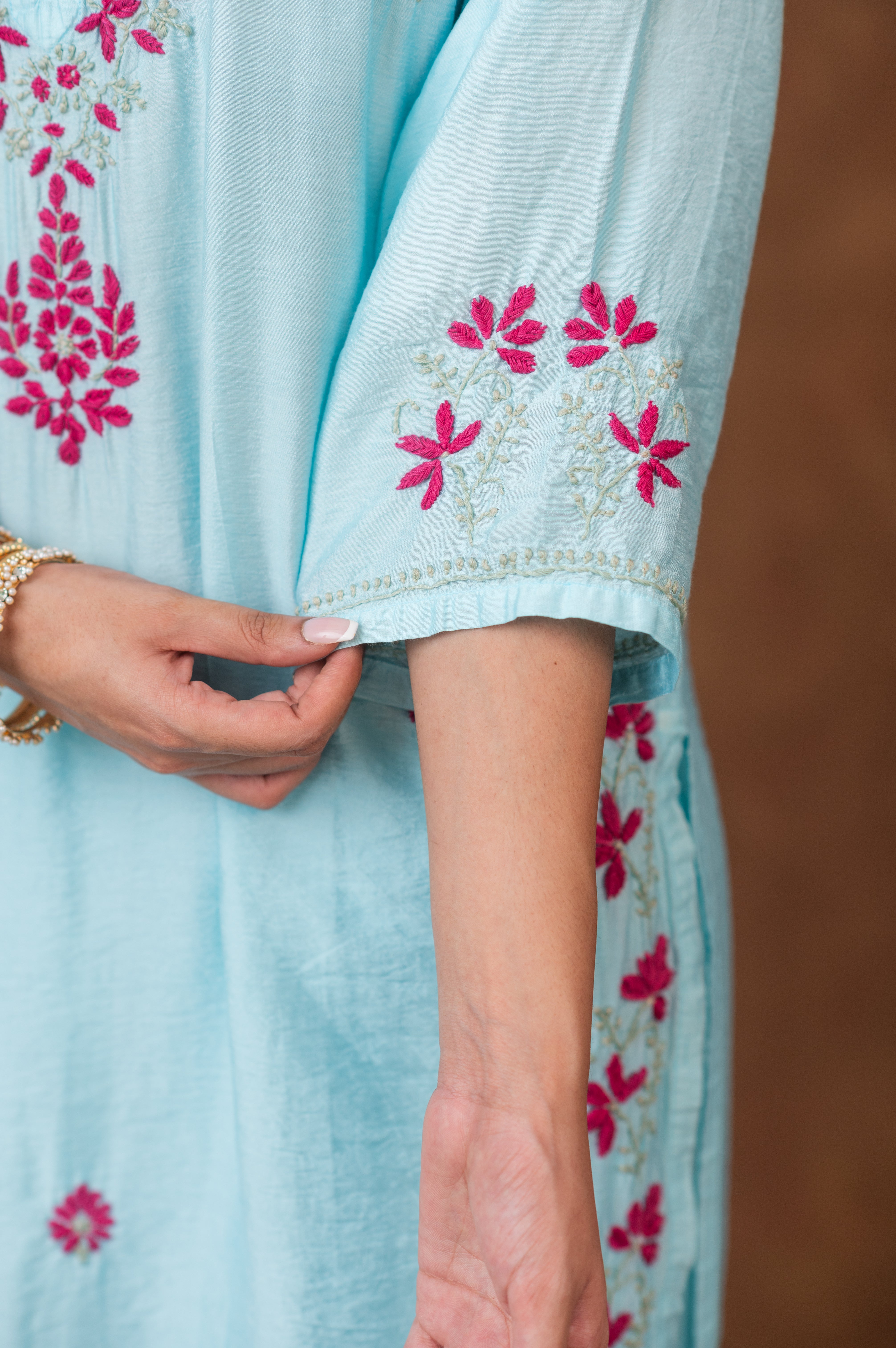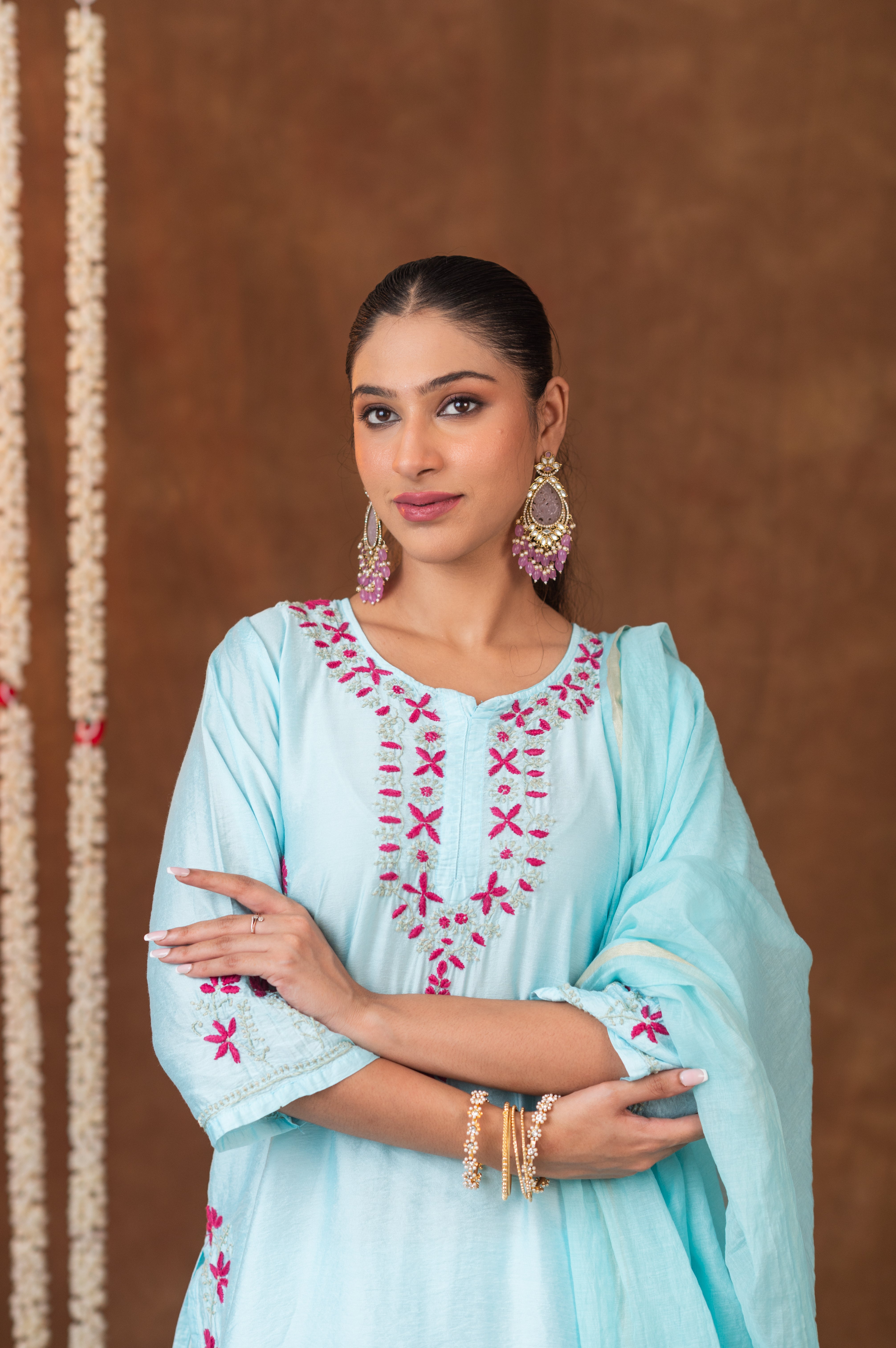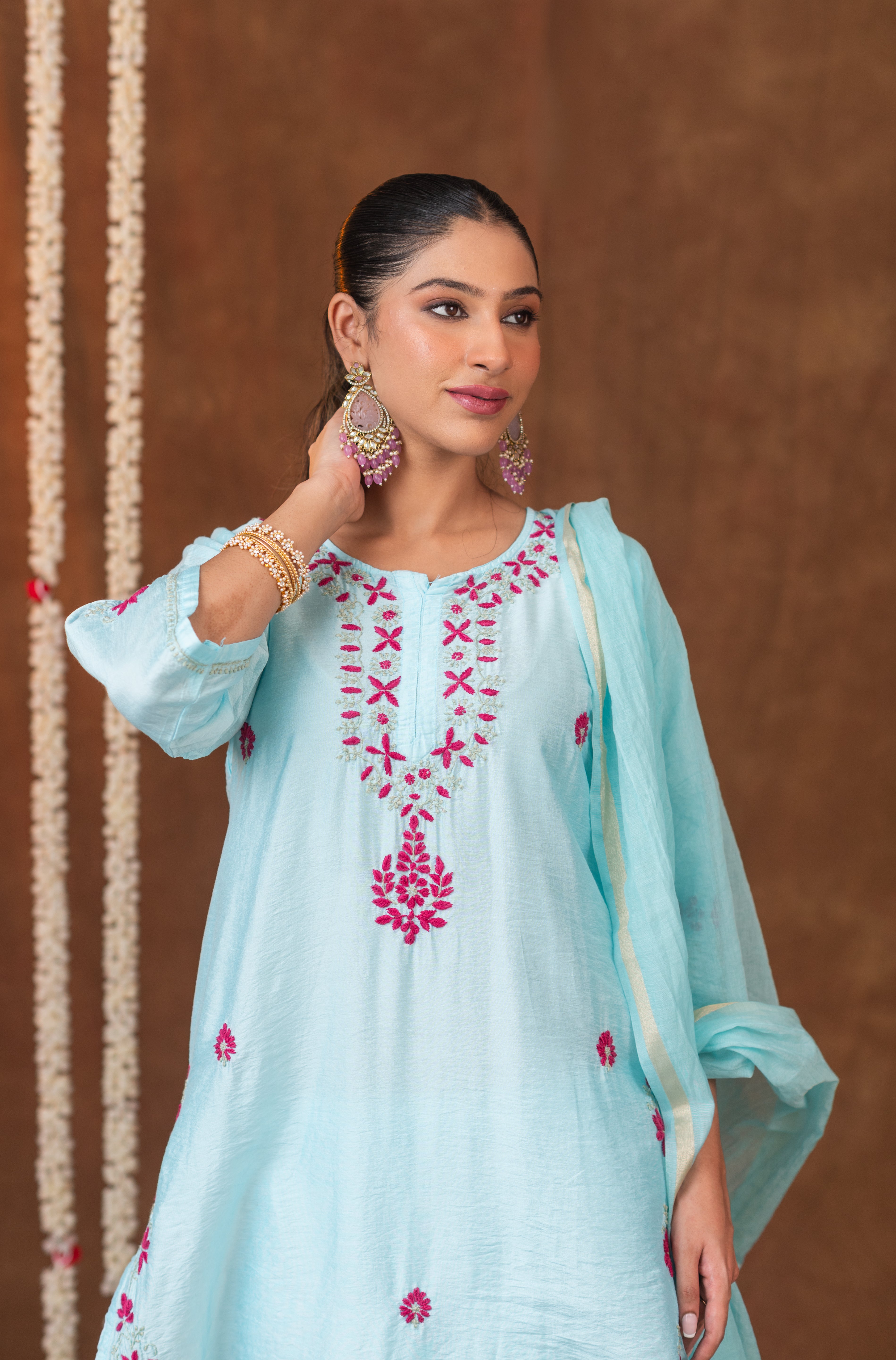 Celebrate the season in timeless elegance with our 3PC Chanderi Silk Powder Blue Chikankari Kurta Set with Dupatta.