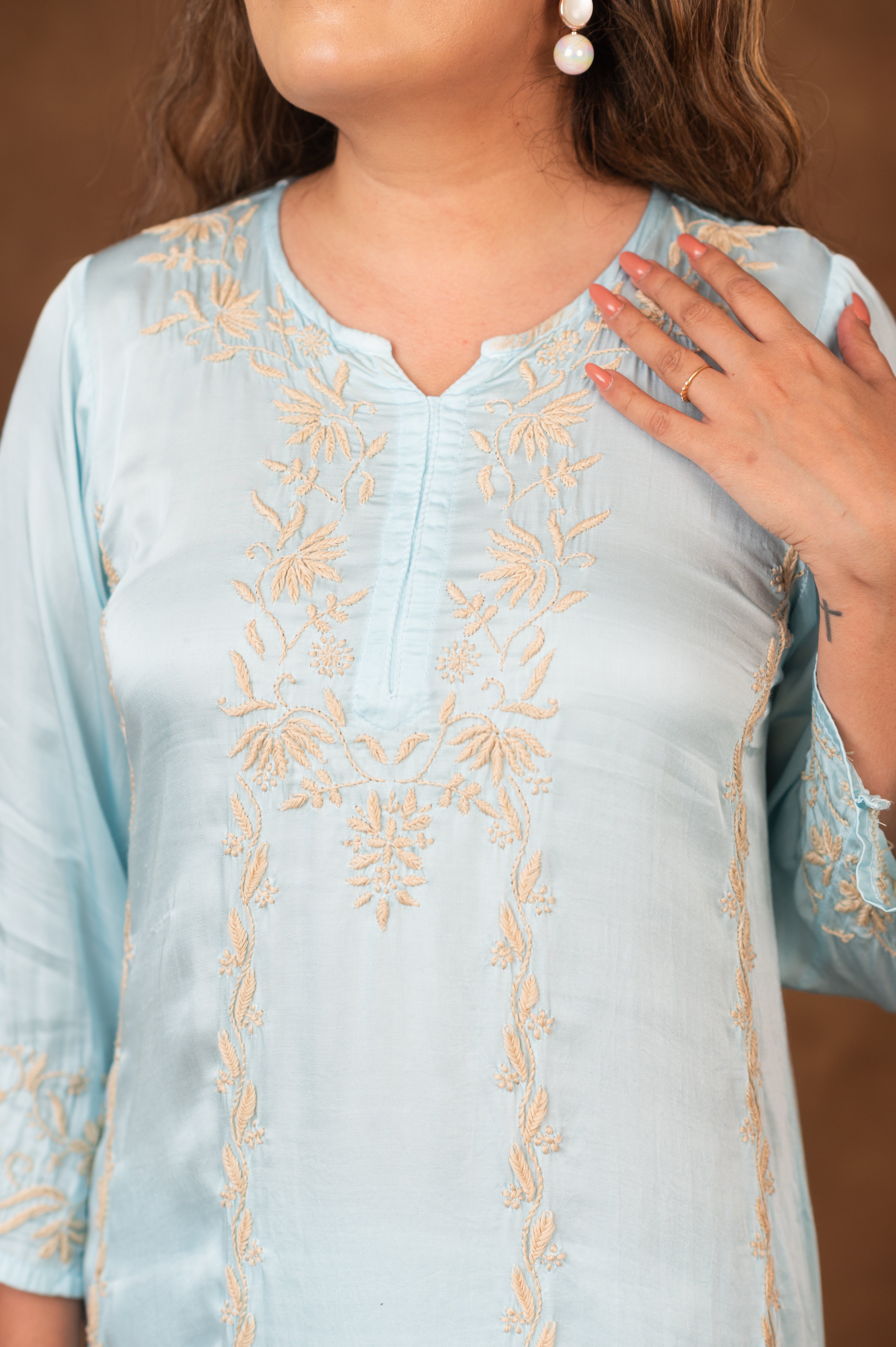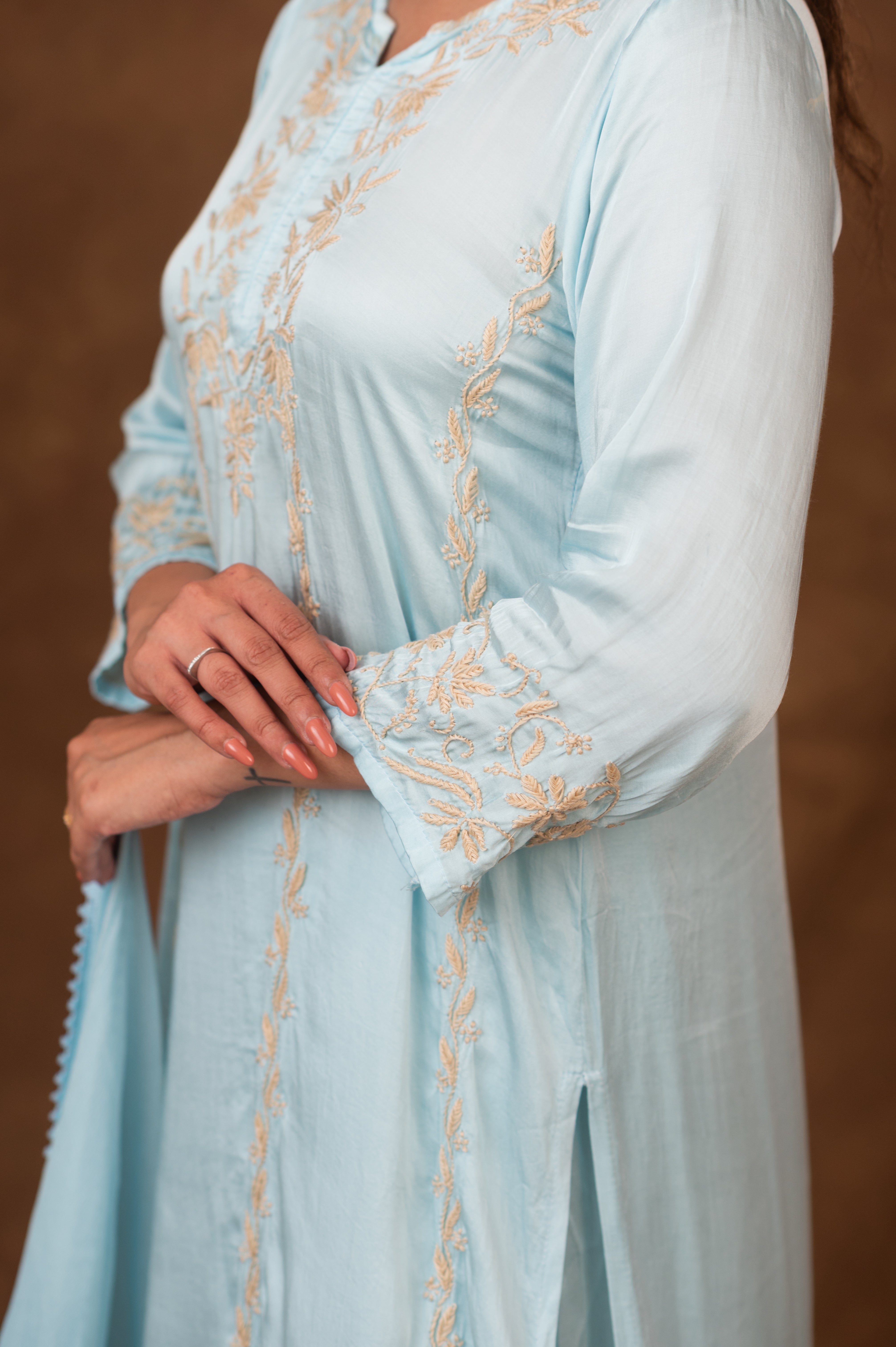 Delicate hand-embroidered Chikankari motifs, rendered in rich golden-brown thread, adorn the kurta with intricate detail. Each stitch is patiently worked by skilled artisans, lending depth, texture, and an unmistakable sense of heirloom artistry to the ensemble.