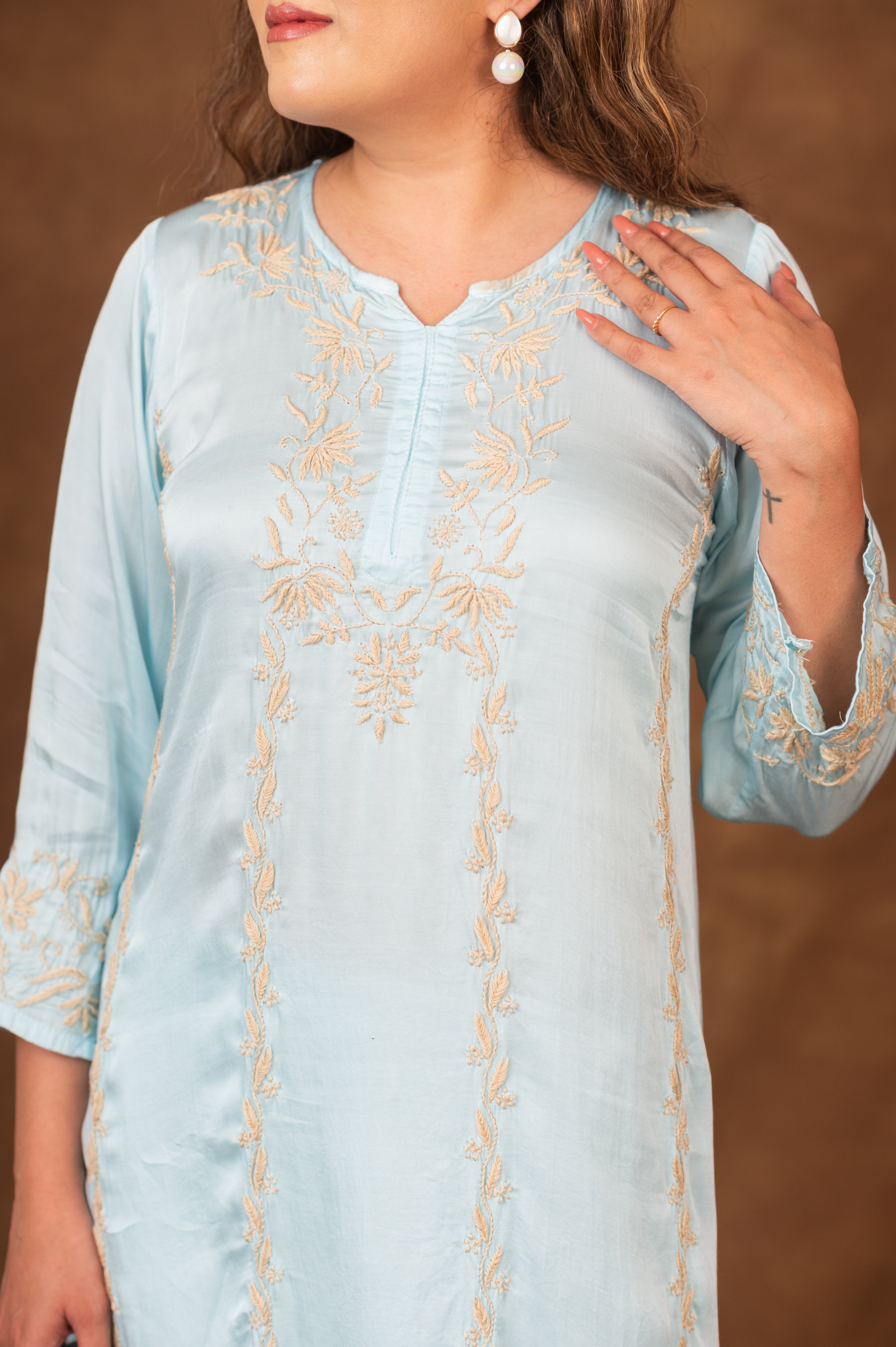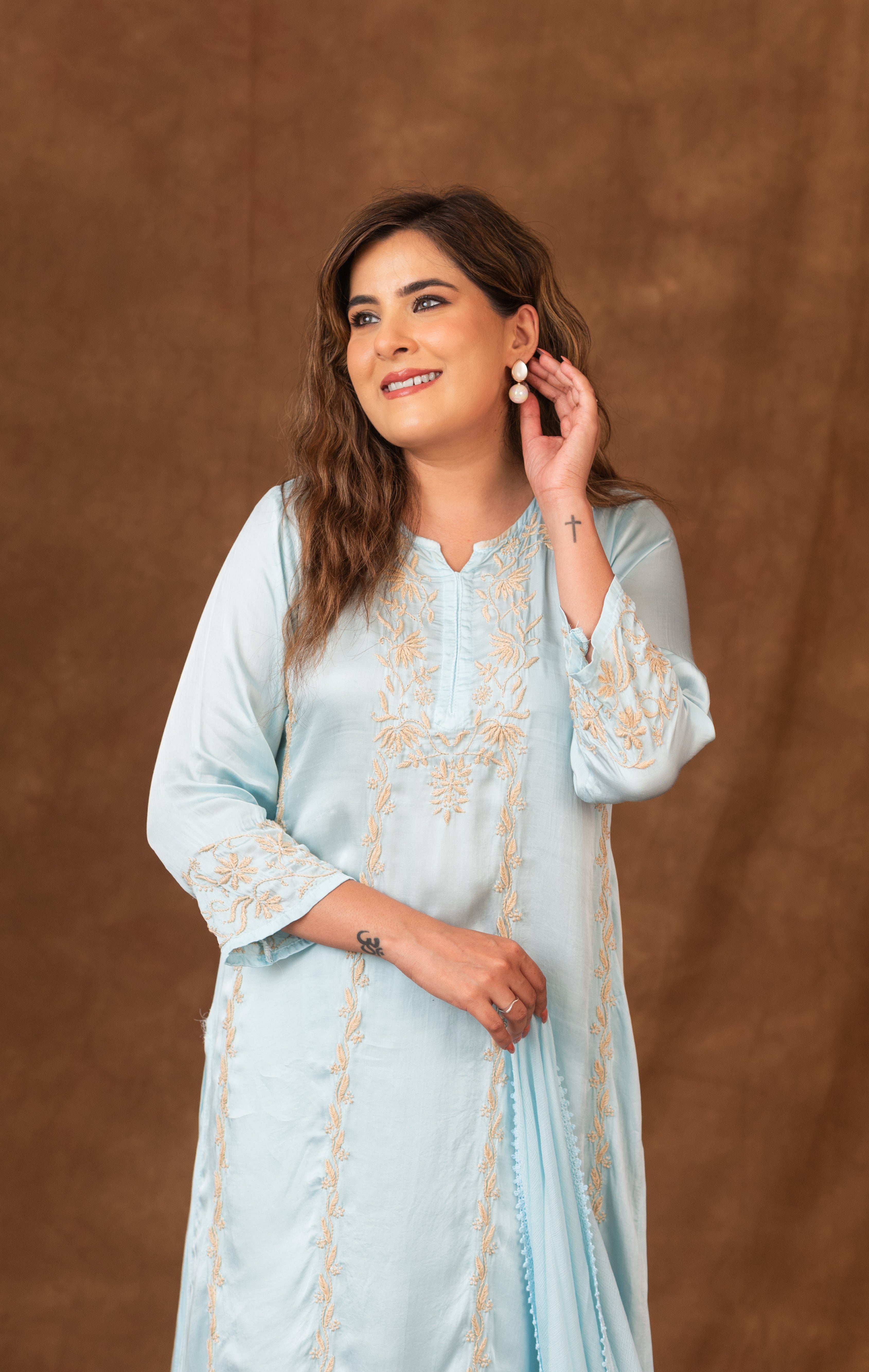 This Modal Satin Turquoise Chikankari Kurta Set from the Jashn collection by Gharana India embodies refined elegance through thoughtful craftsmanship. Crafted in luxuriously smooth modal satin, the fabric offers a fluid drape and a soft, luminous finish that feels indulgent against the skin.