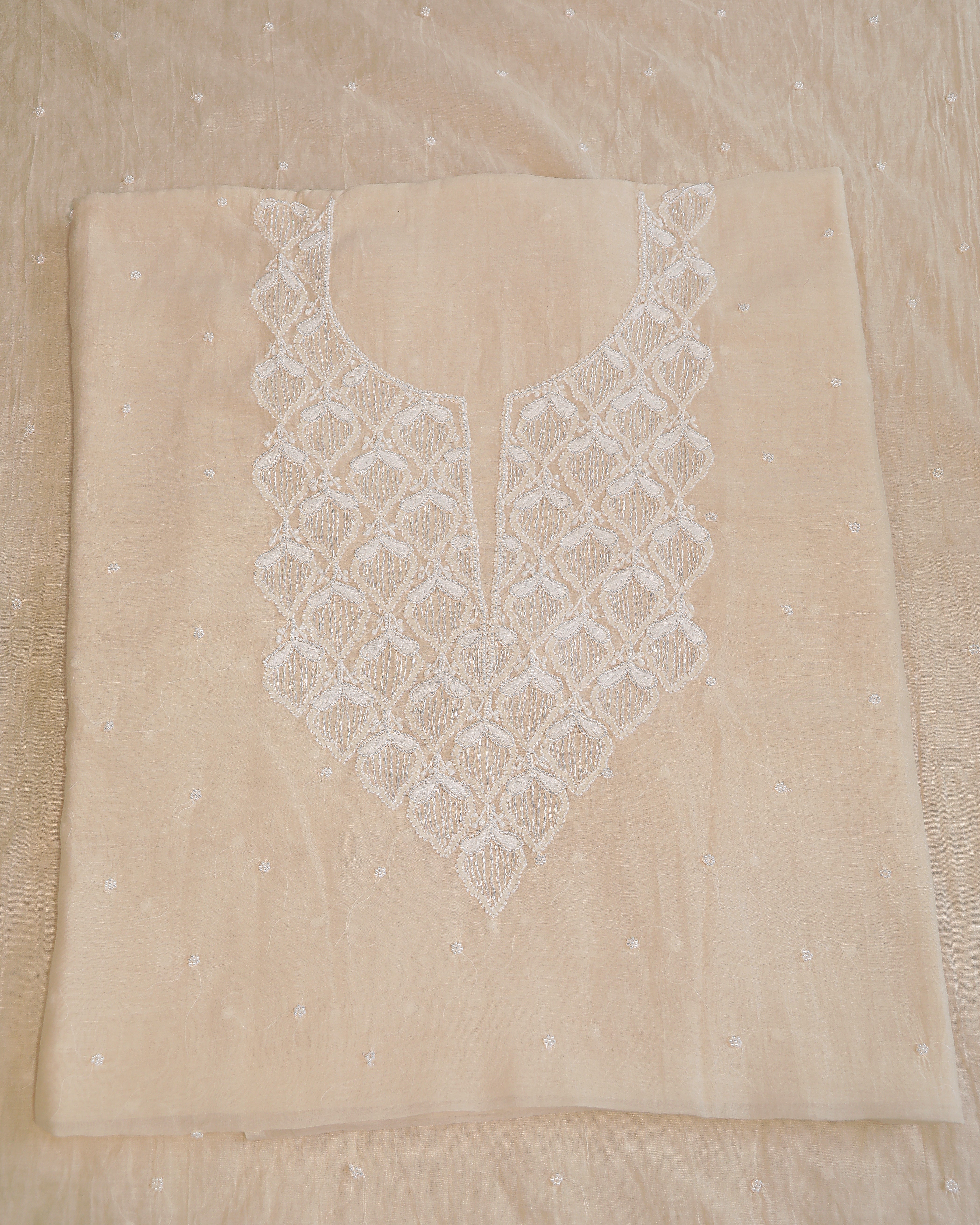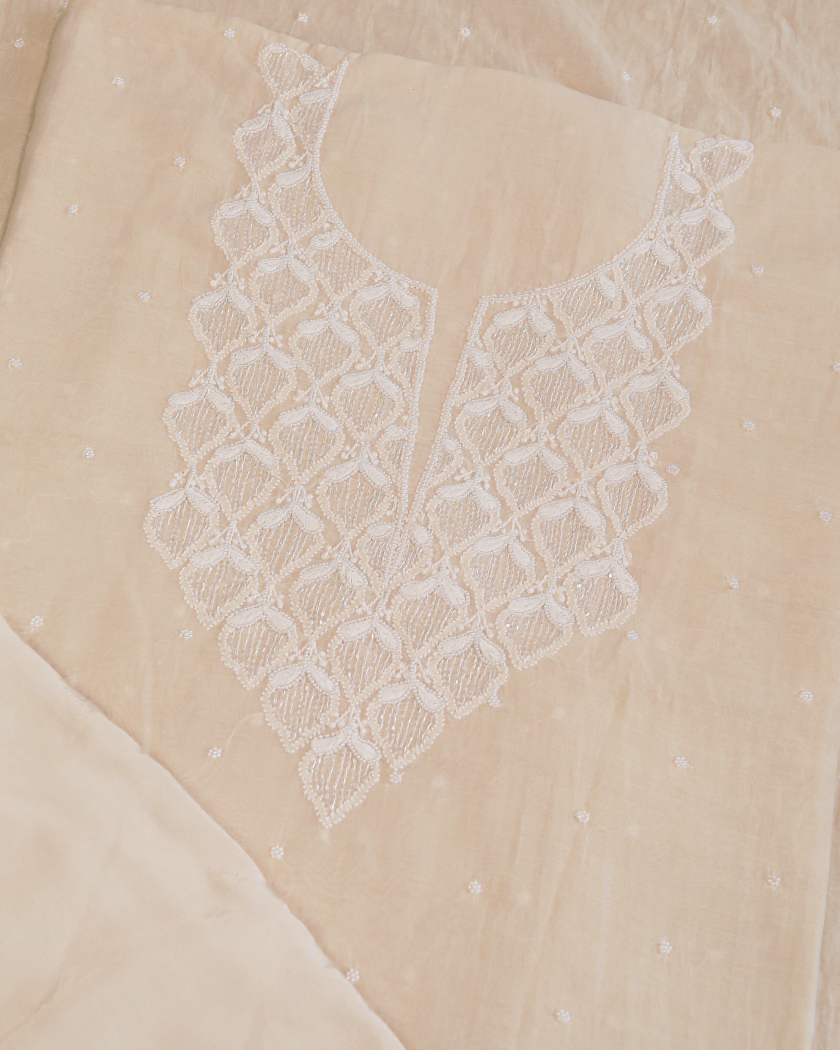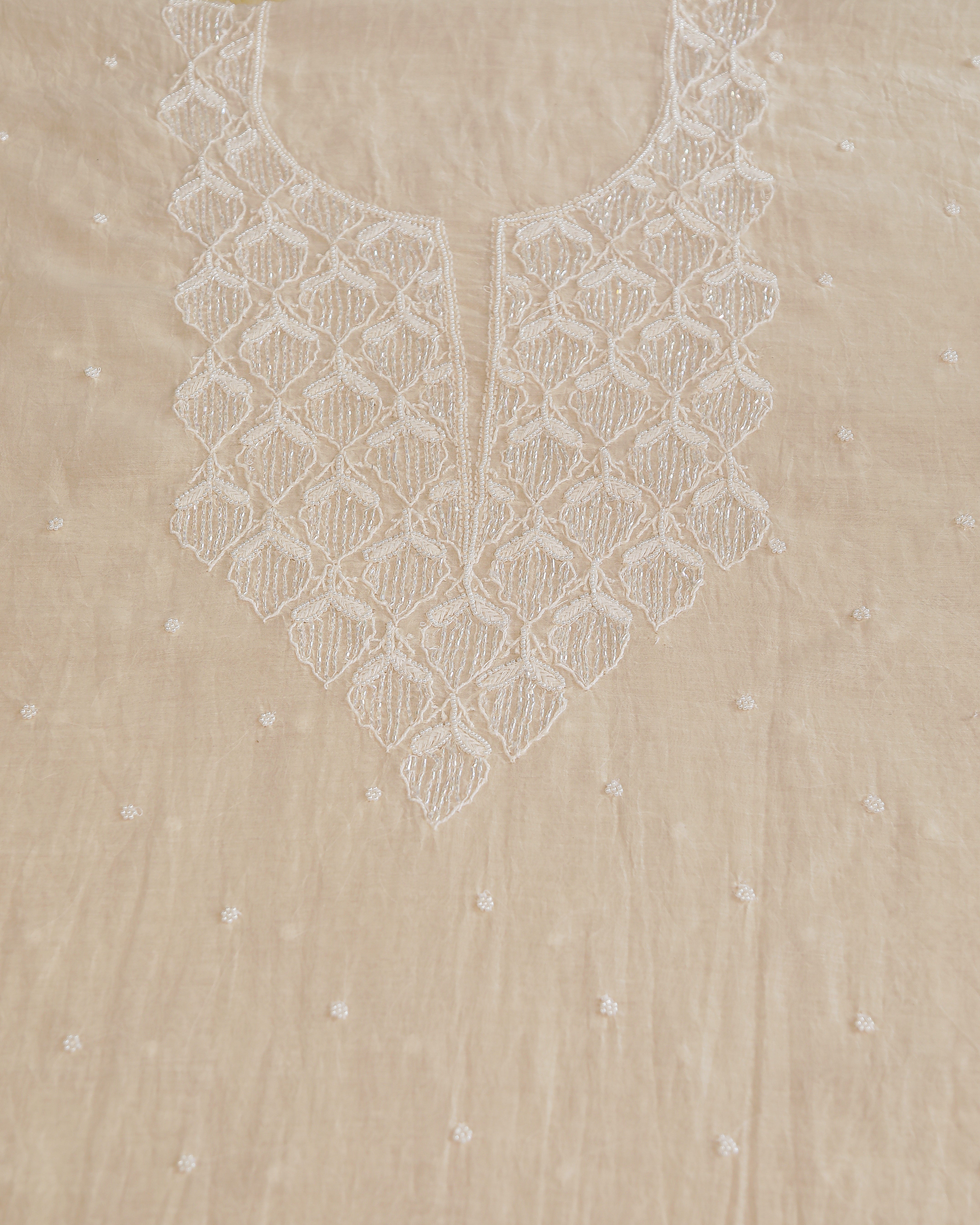 Highlights: Mul Chanderi Unstitched Kurta and Dupatta Set Crafted from luxurious Mul Chanderi fabric embellished in Pearl, Katdana, beads and intricate Jaal work Available in Ivory