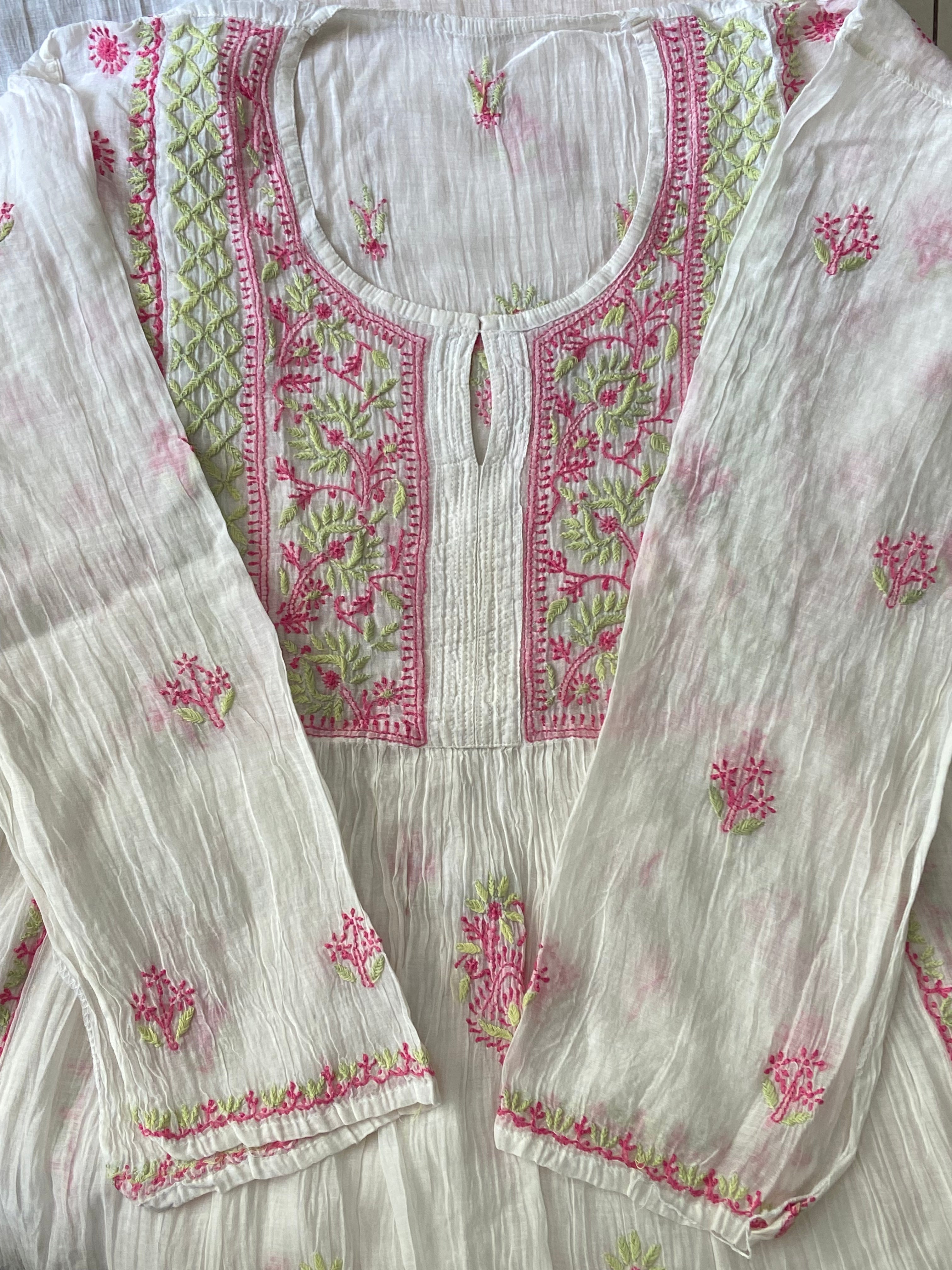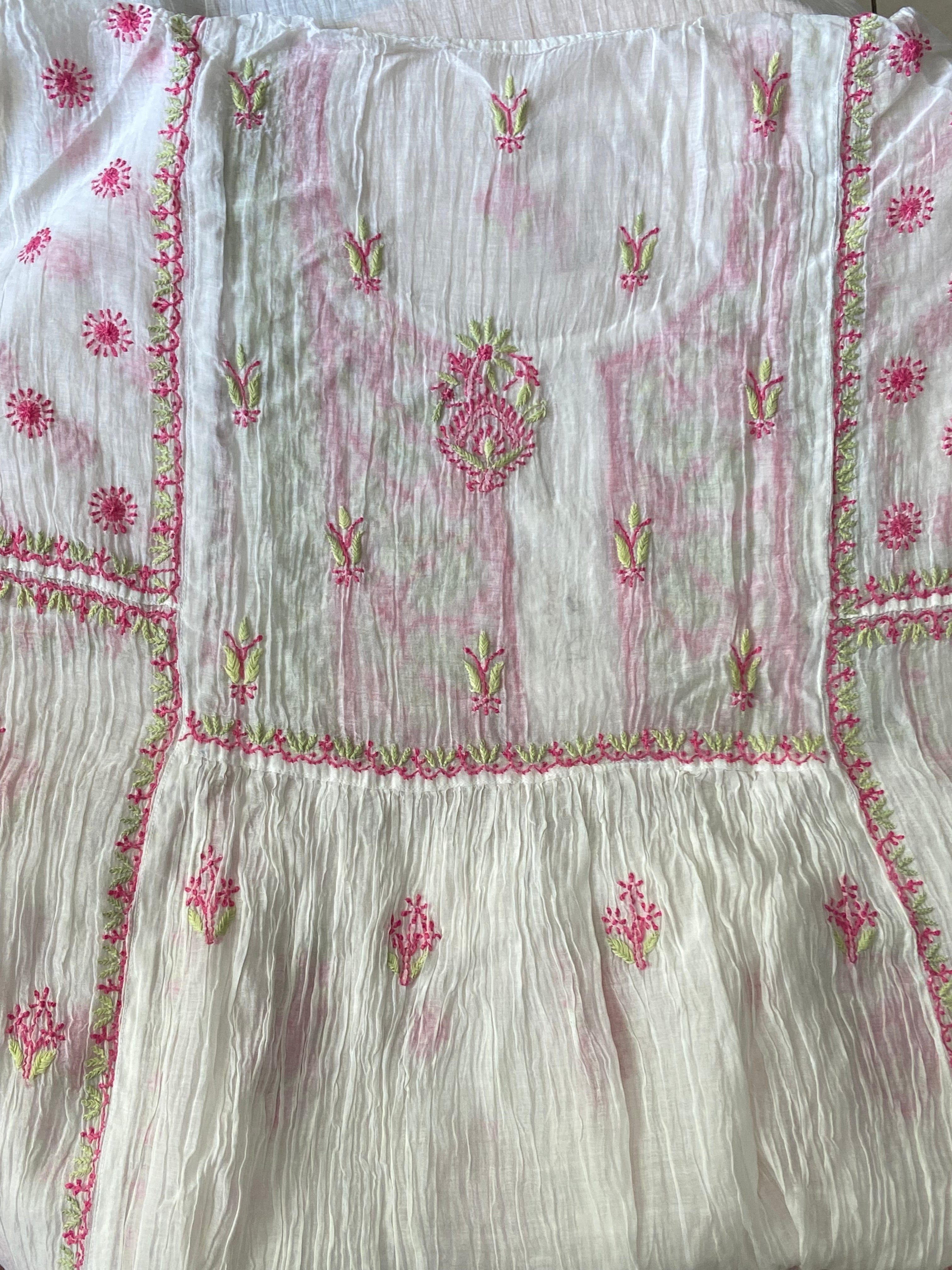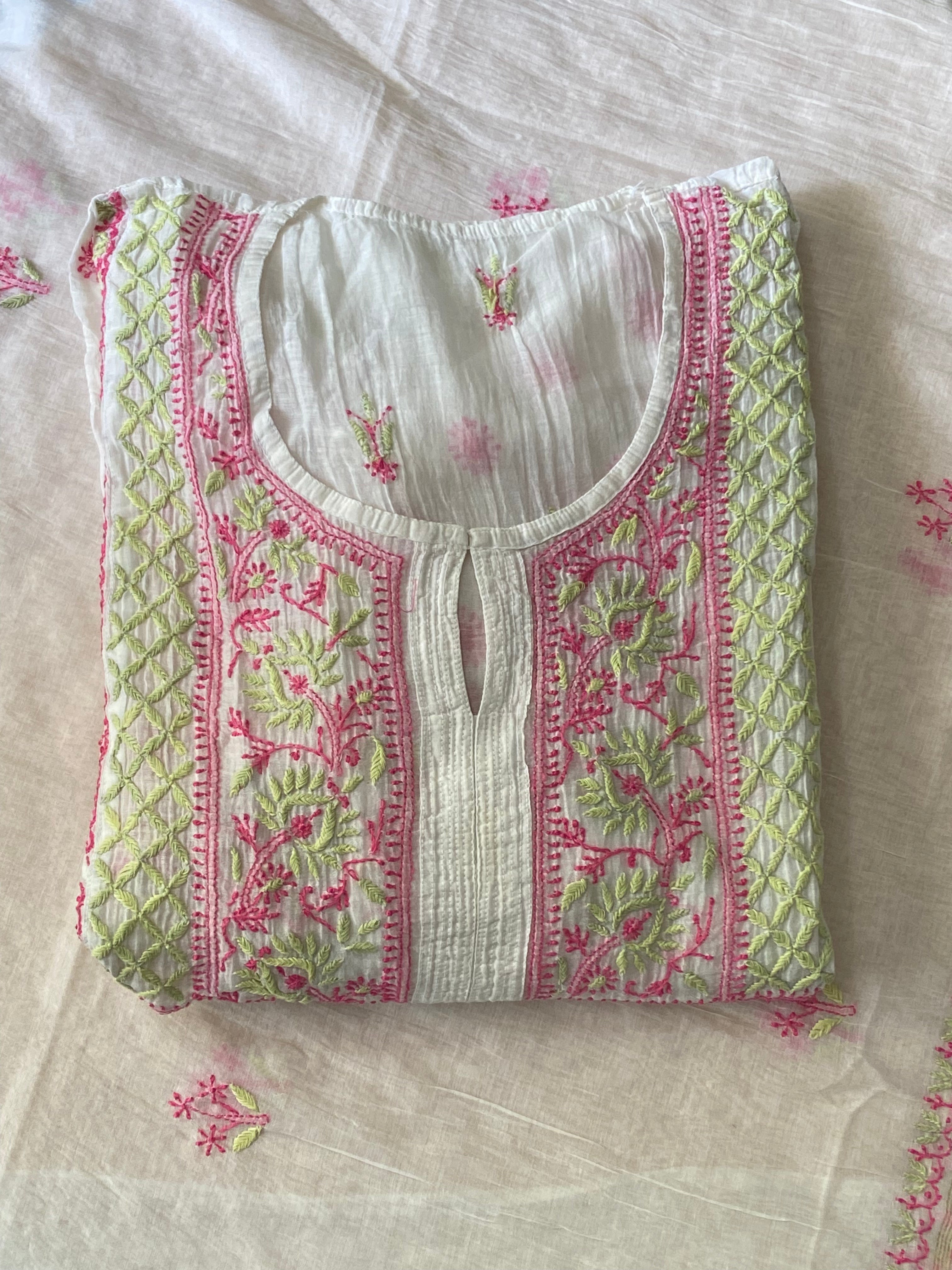 Indulge in sophistication with our exclusive Mul Chanderi Fine Chikankari Semi-Stitched 2 piece Tunic and Dupatta Set in White. Crafted from luxurious Mul Chanderi fabric, this set boasts intricate Chikankari hand embroidery in pink and green thread, adding a unique and graceful touch. The semi-stitched design offers versatility and customization, while the Subtle white hue adds a radiant charm and sophistication to your ensemble. Perfect for various occasions, this set promises to elevate your ethnic attire with finesse and style