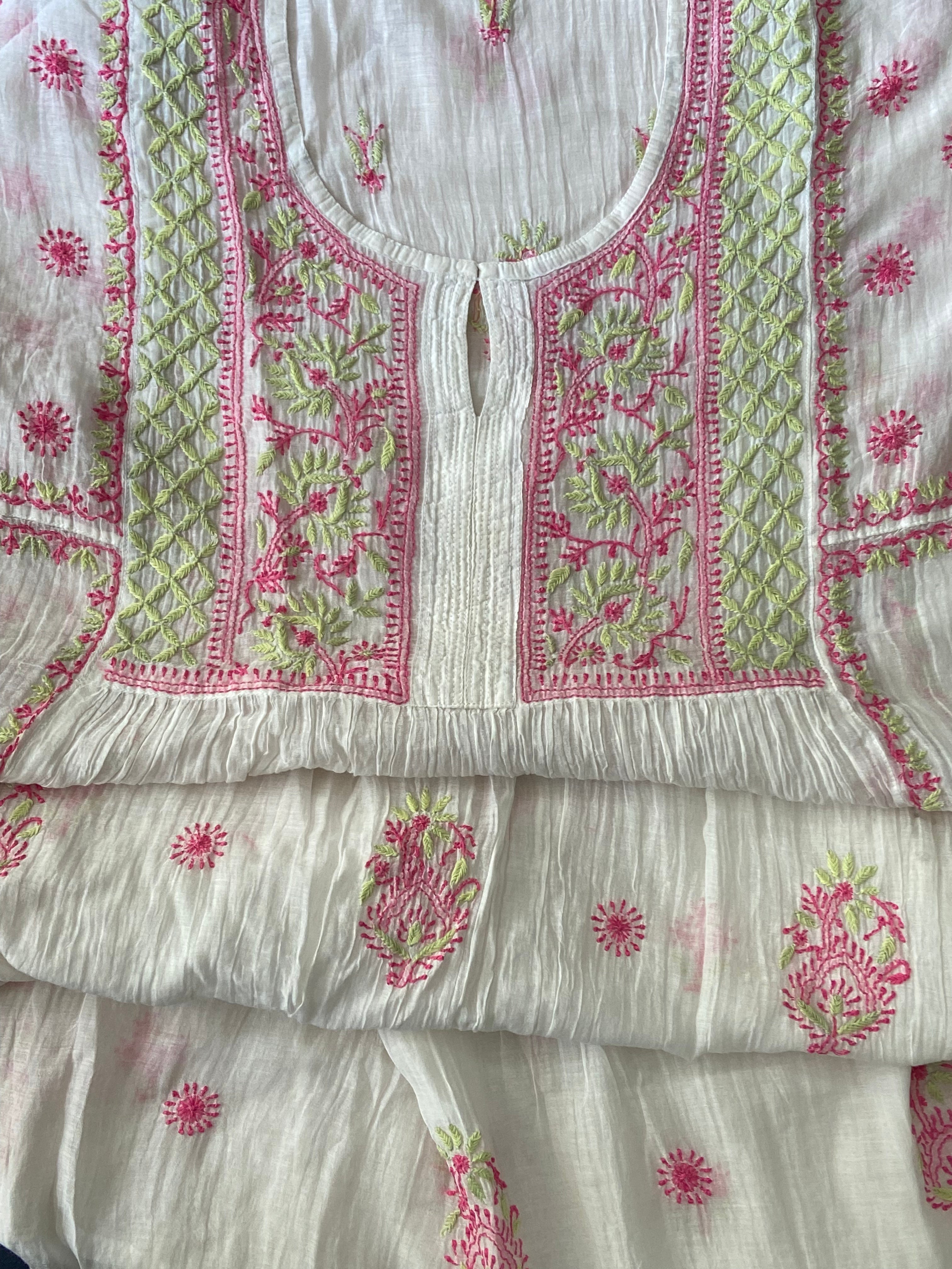 Highlights: Intricate Chikankari on Luxurious MulChanderi fabric in Semi-Stitched Tunic and Dupatta Set in coloured thread for personalized fit